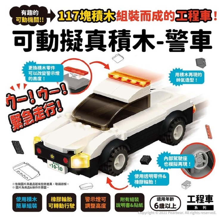 可動擬真積木-警車。以積木再現酷炫造型的魅力。內部駕駛座也模擬再現。橡膠輪胎可轉動行駛!警示燈可調整高度,使用透明零件和橡膠輪胎。