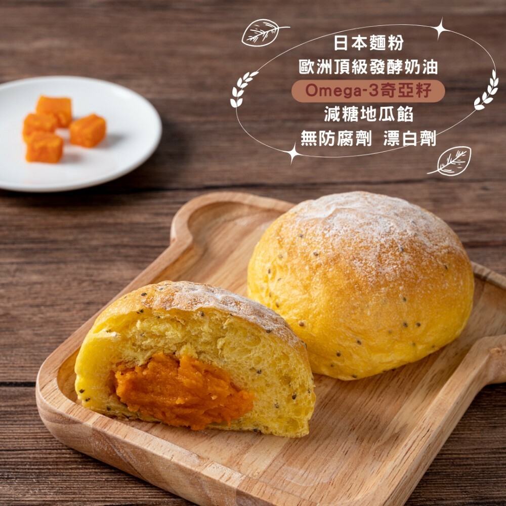 •適合12個月以上的寶寶 *本產品含雞蛋、乳製品 • 歐洲天然發酵奶油,日本麵粉製作 加入超級食物''奇亞籽''助消化 減糖綿密地瓜餡,滿滿膳食纖維 無添加防腐劑,漂白劑,人造奶油 •成分:日本麵粉、鮮奶、雞蛋、糖、無鹽奶油、地瓜、天然乳酪、紅蘿蔔、新鮮酵母、奇亞籽、100%純奶粉、鹽