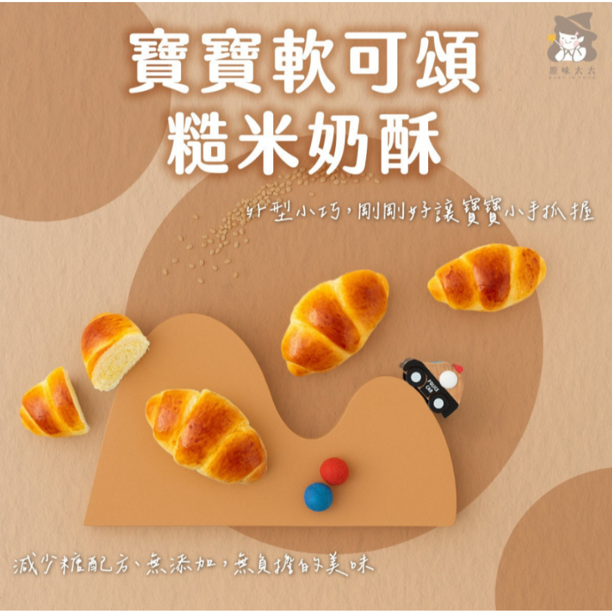 •適合12個月以上的寶寶 *本產品含有麩質穀物、雞蛋、乳製品 •無添加防腐劑、人造奶油、漂白劑 專為寶寶特製輕調味配方''糙米奶酥'' 濃郁奶香無負擔!! 寶寶專屬的''軟可頌''比一般可頌更鬆軟 大小適合寶寶抓握 配方減油,減少糖~ 揉進全麥麵粉增添營養 內餡特製糙米奶酥 微甜不油膩無負擔寶寶吃得安心!! •成分►日本麵粉、鮮奶、糖、雞蛋、無鹽奶油(乳脂、水、非乳脂固體、乳酸菌)、100%純奶粉、酵母(天然酵母、水、卵磷脂)、全麥麵粉、糙米粉、鹽、葵花油 •建議食用年齡►建議一歲以上寶寶食用 •內容物►每份約40克,本包裝含4份,共160公克 ±10% •烹調方式► -無須退冰,電鍋蒸12分鐘(更鬆軟) -無須退冰,烤箱180度烤3~5分鐘 •保存方式►冷凍保存,開封後請儘速食用 •保存期限►4個月,從收到商品開始算2個月以上有效期限。 *本產品含有麩質穀物、雞蛋、乳製品 •注意事項►若小孩對上述內容物過敏,請勿食用