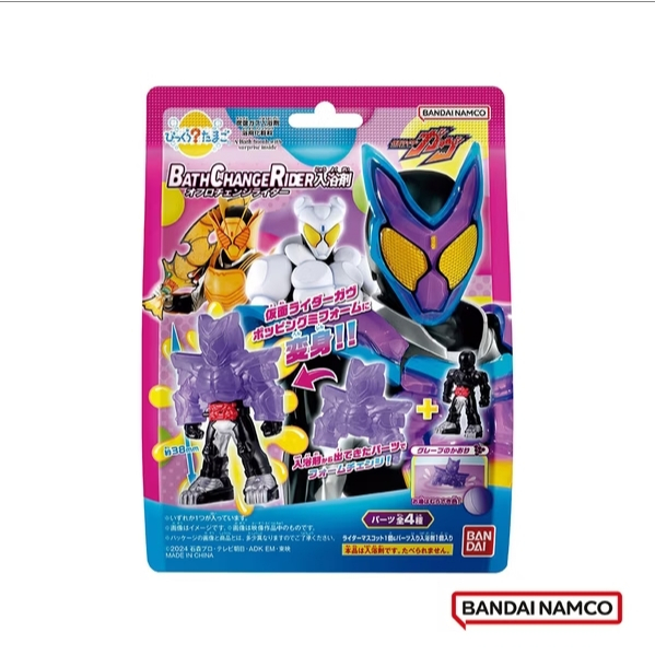 每顆入浴球內含1個變身配件,共4種,採隨機出貨, 將入浴球放入水中,等溶化後變身配件就會浮出水面! 將變身配件套到附上的假面騎士小公仔,就可變身成假面騎士Gavv戰鬥! 組裝後高度約38mm。 香氣:葡萄香 以令和第6作《假面騎士Gavv》為主題,入浴球含1個變身配件,共4種, 另附1個假面騎士Gavv小公仔,採隨機出貨! P.S.2024年9月1日在日本朝日電視台播放。 每顆入浴球內含1個變身配件,共4種,採隨機出貨, 將入浴球放入水中,等溶化後變身配件就會浮出水面! 將變身配件套到附上的假面騎士小公仔,就可變身成假面騎士Gavv戰鬥! 組裝後高度約38mm。 香氣:葡萄香 ~ 共4種變身配件,會出現哪一種呢?採隨機出貨! 1.假面騎士GAVV小公仔+砰擊軟糖形態配件 (仮面ライダーガヴ ポッピングミフォーム) 2.假面騎士GAVV小公仔+砰擊軟糖形態(踢擊軟糖輔助)配件 (仮面ライダーガヴ ポッピングミフォーム(パンチングミアシスト)) 3.假面騎士GAVV小公仔+蓬鬆棉花糖形態配件 (仮面ライダーガヴ ふわマロフォーム) 4.假面騎士GAVV小公仔+脆脆洋芋片形態配件 (仮面ライダーガヴ ザグザグチップスフォーム) 適用年齡:3歲以上;用途:清潔身體。 使用方法:放入水中(約200L)溶化後,即可泡澡。※泡澡後,請將身體沖洗乾淨。 保存方法:置於陰涼處,避免陽光直射。 包裝尺寸:約寬11*高13.5*深4cm;總重:約70g(含包裝) 規格說明 品牌-BANDAI 品名-假面騎士Gavv變身入浴球(2024)(泡澡球)(限量) 全成份-碳酸氫鈉、檸檬酸、硫酸鈉、澱粉糊精、聚甘油-3、香料、色素藍1、紅33 主要材質-公仔-塑膠(TPR);配件-塑膠(PP) 淨重-55g(含小公仔1個) 入數-1入 有效期限-5年 原產地-中國 國際條碼-4570117994272 ------------------------ 警告-內含小物件,不適合未滿3歲兒童使用。 ✎注意事項: 1.本品為入浴劑,僅供外用,肌膚易敏感者,請斟酌使用,若有不適請停止使用,並詢問醫生。 2.避免窒息危險發生,拆卸後塑膠袋請立即銷毀、丟棄。 3.不能食用,請保管於孩童無法取得之處。 4.請在成年人的監護下正確使用。 5.使用中地板或浴缸容易打滑,不適用大理石,木質浴缸。 6.公仔為塑膠材質,請勿長時間接觸於沙發、墊子或磁磚上,以免造成染色。 7.本產品已通過玩具安全檢驗合格,請安心使用