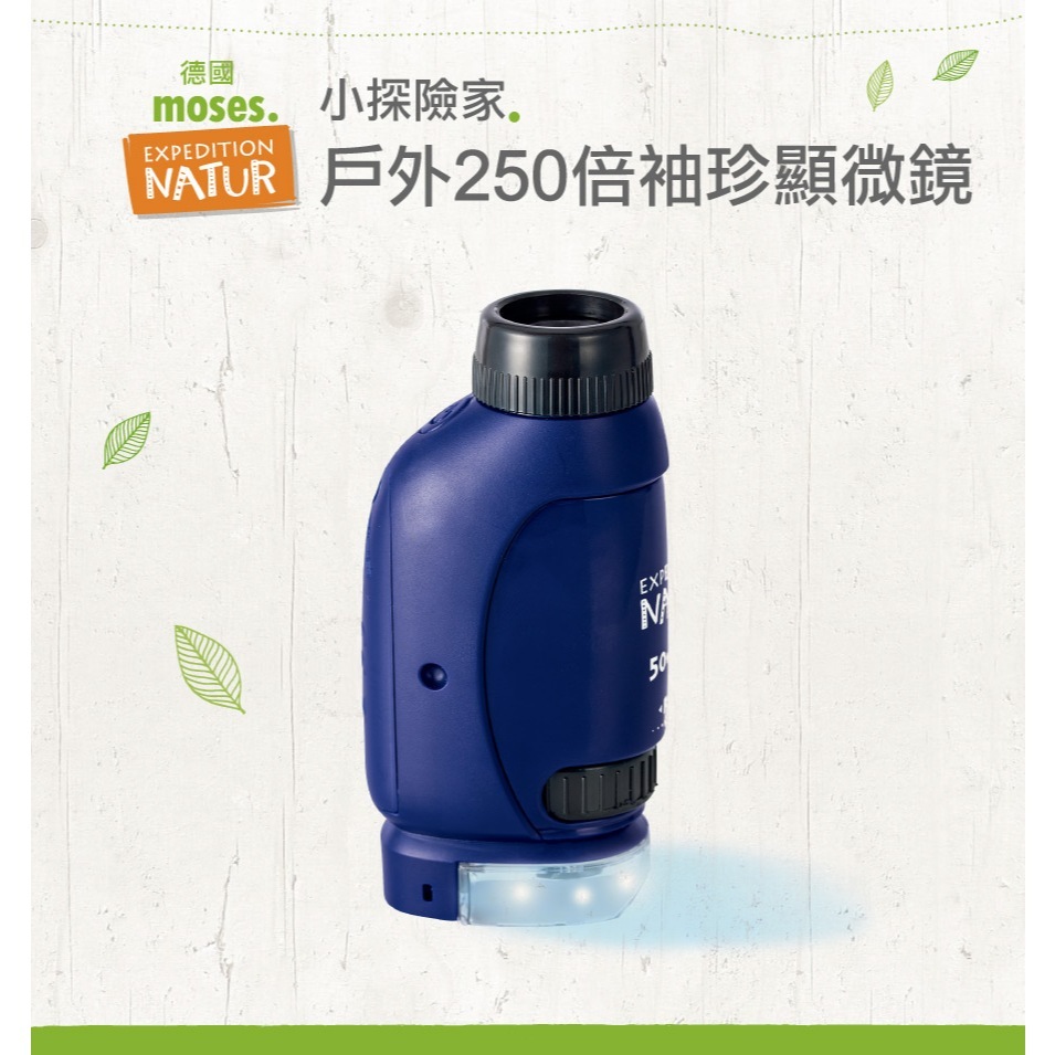 這款袖珍顯微鏡提供驚人的50倍至250倍放大倍率,動植物的微小細節清晰可見,甚至連螞蟻回巢的隊伍都能看得一清二楚!體積輕巧,無論放在口袋或背包裡都剛剛好,走到哪、帶到哪,隨時做觀察! ● 50至250倍放大倍率 ● 小巧輕便,適合隨身攜帶 ● 操作直覺簡單,輕鬆上手 ● 內建LED照明,夜間也能觀察 ● 內附可更換鈕扣電池(3顆LR44) 注意事項 ·LED燈亮度極高,請勿直接照射眼睛。 ·當鏡面髒汙時,請勿以水沖洗或潔潔液擦拭;為避免刮傷,僅需以柔軟乾淨的拭鏡布擦拭即可。 ·請勿將此產品置於浸水或潮濕的環境中。 ·請置於兒童不易取得處,孩童使用請有大人在旁陪同。 ·請勿自行拆卸本產品。 ·長時間不使用請取出電池,避免電池漏液損壞本產品。 ·請勿將新舊電池、不同類型電池混用。 使用年齡:3歲以上 包裝尺寸:7x5x9.5cm 包裝重量:約62g 材質:塑膠、LED燈 內附可更換鈕扣電池(3顆LR44) 產地:MOSES授權中國廠製造