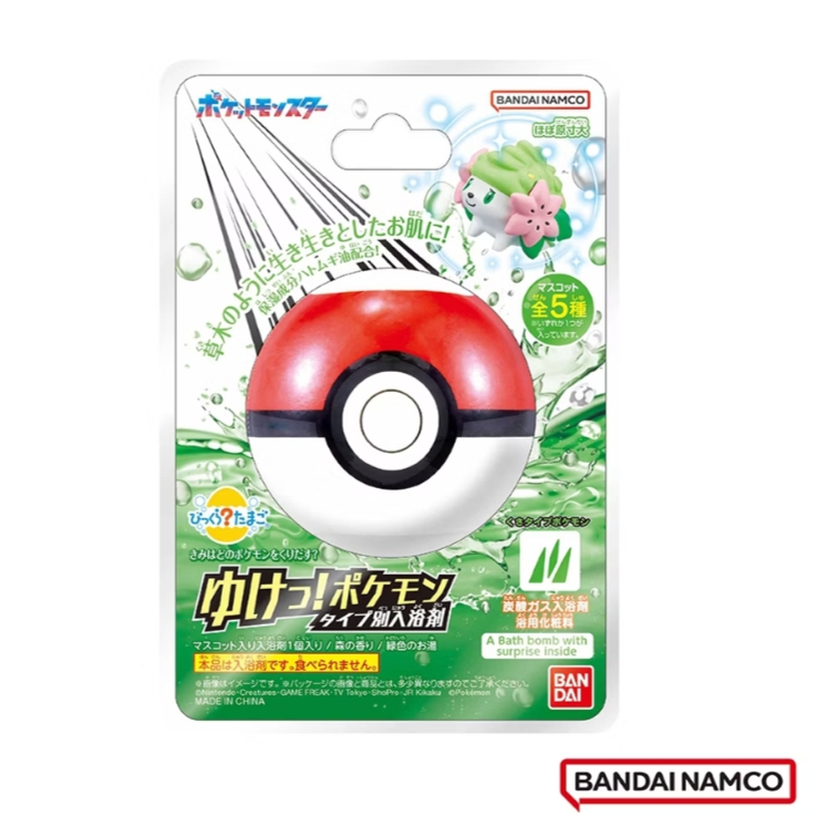 「寶可夢GO! 屬性入浴球」新登場,全系列共18種屬性的寶可夢為主題, 泡澡時,重現寶可夢動畫中丟出精靈球的經典場景, 會出現哪個寶可夢呢?就讓我們一起來抓寶吧!! 搭配薏仁萃取成分,共五款草屬性寶可夢,就讓我們一起來抓寶吧!! 內含1個草屬性寶可夢小公仔,先將封膜撕掉,再將入浴球丟入水中, 一開始水會變白色,漸漸的轉變為綠色,等溶化後,就可以補捉到寶可夢喔! 共有妙娃花、蔓藤怪、坐騎山羊、謝米及新葉喵等五款寶可夢,一起來收藏吧!超級可愛! 香氣:森林香 ~共5種,內含1個草屬性寶可夢公仔,採隨機出貨。 1.シェイミ(ランドフォルム)(謝米陸上形態) 2.フシギバナ(妙娃花) 3.ニャオハ(新葉喵) 4.ゴーゴート(坐騎山羊) 5.モンジャラ(蔓藤怪) 適用年齡:3歲以上;用途:清潔身體。 使用方法:放入水中(約200L)溶化後,即可泡澡。※泡澡後,請將身體沖洗乾淨。 保存方法:置於陰涼處,避免陽光直射。 包裝尺寸:約寬10.2*高14.5*深4cm;總重:約129g(含包裝)
