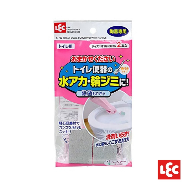 不需任何清潔劑,只要沾水,就能輕鬆清除頑強水垢及污漬,內含有效抗菌劑,清潔的同時也能除菌,馬桶亮晶晶! LEC 陶瓷馬桶專用,附握柄,採用輕石研磨材質 產品特色 1.馬桶專用,不須洗劑就能輕鬆清除頑強水垢及污漬。 2.可去除髒污及雜菌,具有除菌效果。※並非能除去所有的菌種。 3. 採用輕石研磨材質減少刮痕,為拋棄式商品。 4. 馬桶邊緣內側狹窄處也能輕鬆刷洗。 5. 含有薰衣草香氣。 用途:馬桶清潔用;尺寸:約寬3*高15.5*深2.5cm,2入;耐熱溫度:約60℃ 使用方法:沾水後刷洗即可。 保存方法:避免火源高溫處。 規格說明 品牌:日本LEC 材質:研磨材-輕石(有機系抗菌劑、薰衣草油);海綿-聚氨酯(PU塑膠);握柄-塑膠(PE) 數量:1 產地:日本 ---------------------------------------------------- 限陶瓷馬桶清潔用,請勿做用途外使用。 僅適用於白色或淺色系馬桶,不適用深色系;請勿使用於表面有防污加工的馬桶。 本產品不適用清除已刮傷或已深入裂痕中的水垢及污漬。 若擔心刮傷,請先於不明顯處試刷,確認沒有刮傷再使用。 研磨材質耗損以致髒污不易清除時,請更新。 請注意,刷洗馬桶邊緣內側,海綿會耗損較快。 請勿與中性洗劑以外的洗劑一起併用。 使用時,建議配戴手套。 請勿放置火源或高溫處。 商品及包裝可能因改良等而有所變更。