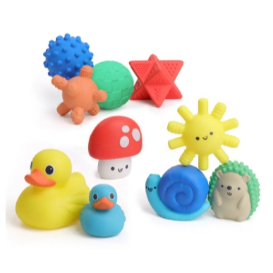 ● 內含4個噴水玩具、4個形狀玩具、2隻鴨鴨 ● 洗澡時光充滿創意與樂趣 ● 大小適中,圓潤設計好抓握 ● 軟Q材質可捏可握,訓練小手肌肉 ● 凹凸紋理豐富,刺激寶寶觸覺發展 ● 色彩鮮明,滿足多元感官探索 ● 通過ASTM F963安全玩具規範 ● 趣味造型設計,親子洗澡更開心