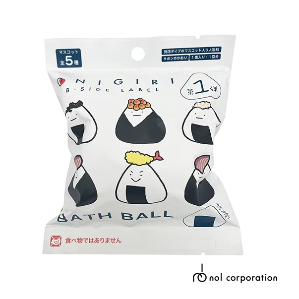 日本人氣B-SIDE LABEL推出入浴球! 把人氣的「御飯糰」化身小公仔第1彈登場, 共5種,超可愛一起來收集吧!擺在書桌、辦公室、居家空間做為擺飾, 為您增添療癒空間!泡澡兼具趣味! 御飯糰造型入浴劑,每顆入浴球都內含1個御飯糰上面含餡料的小公仔, 共5種,採隨機出貨!將入浴球放入水中,溶化後小公仔就會浮出水面喔! 公仔超級可愛,很值得收藏喔!就讓我們一起收集吧! 香氣:清新皂香 ~共5種,採隨機出貨~會出現哪個可愛的御飯糰呢?! 1.炸蝦(天むす);2.昆布;3.鮪魚沙拉(ツナマヨ);4.鮭魚卵(いくら);5.紅鮭 適用年齡:12歲以上;用途:清潔身體。 使用方法:放入水中(約200L)溶化後,即可泡澡。※泡澡後,請將身體沖洗乾淨。 保存方法:置於陰涼處,避免陽光直射。 包裝尺寸:寬11*高12.5*深5cm;總重:約90g(含包裝)   品牌-NOL 品名-B-SIDE LABEL御飯糰入浴球Ⅰ(泡澡球) 全成份-碳酸氫鈉、檸檬酸、硫酸鈉、碳酸鈉、酒石酸、乳木果脂、羧甲基纖維素、聚乙二醇-400、香料、硫酸月桂酸鈉 主要材質-塑膠(TPR) 淨重-約80g(含小公仔1個) 入數-1入 有效期間-5年 原產地-中國 國際條碼-4589856284384
